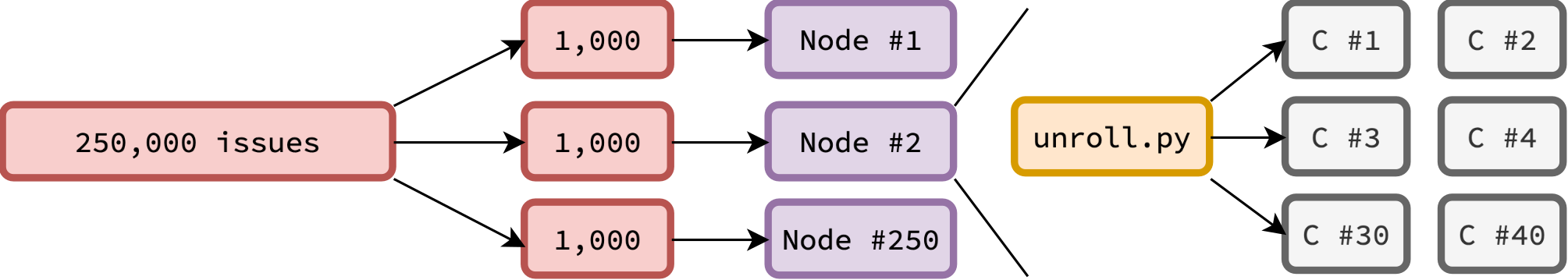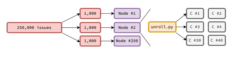 Each node can unroll roughly 200–300 trajectories per hour. Sequentially generating 250k trajectories would thus take over a month — so we parallelized aggressively. With ~200 nodes, the entire dataset can be generated in under five hours. Each node operates independently, making job scheduling and dataset partitioning straightforward: