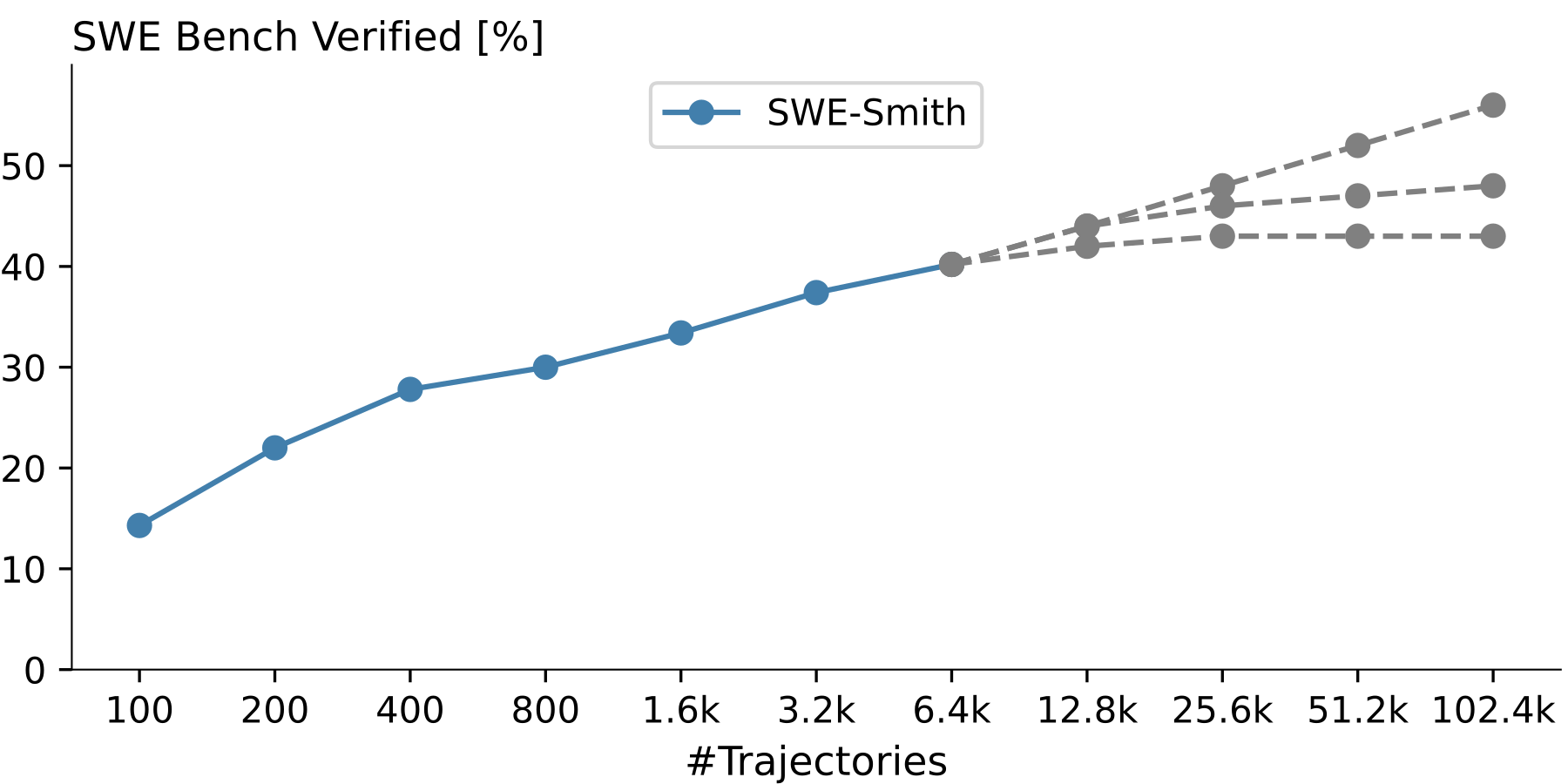 As we scaled training data 20x compared to SWE-Smith and improved performance by over 15% points on SWE Bench Verified, we quickly observed the near log-linear scaling, described in earlier work, to saturate with improvements beyond ~40% becoming super-exponentially harder.