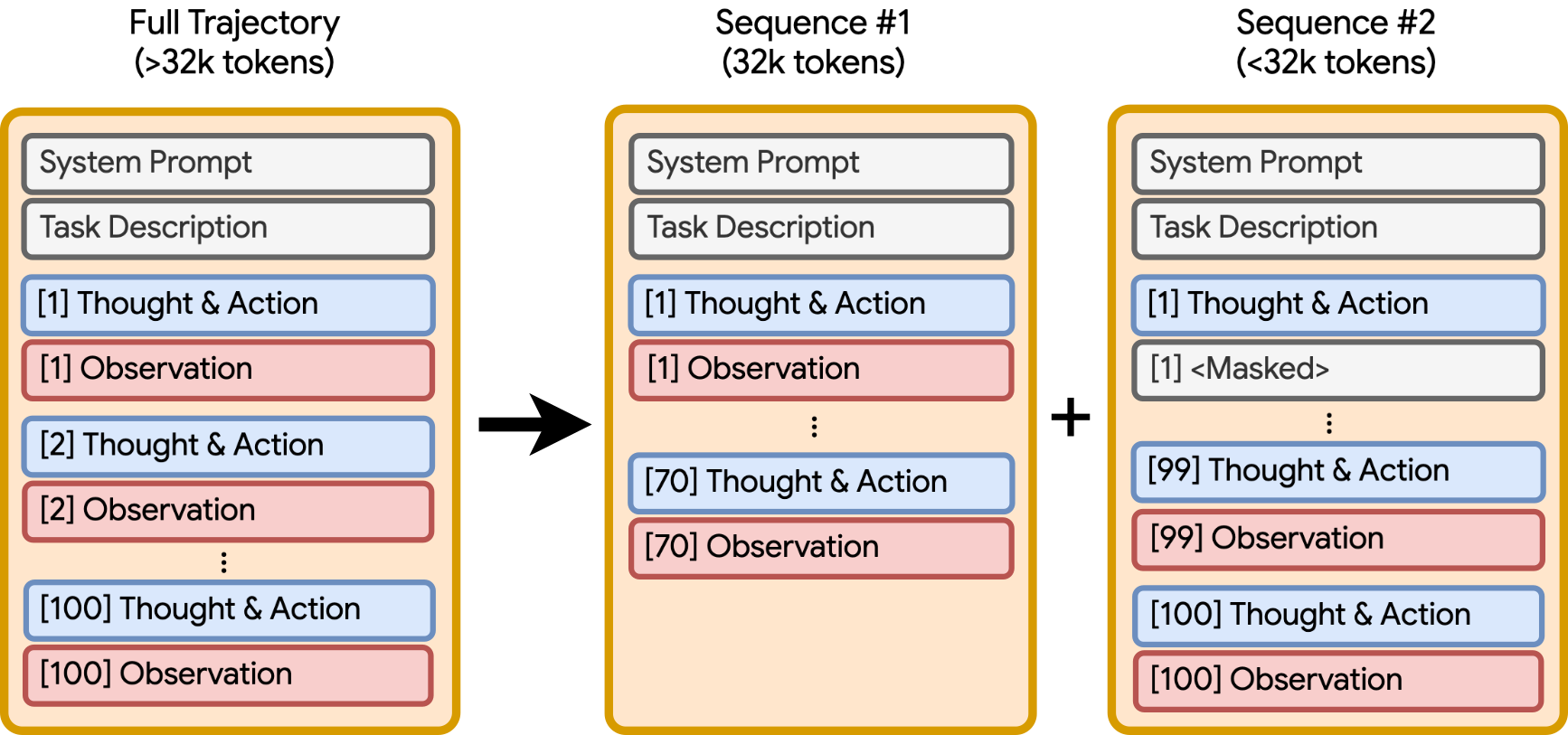 Our design mirrors OpenHands in both tooling and condensation. The agent has access to four tools: think, execute_bash, str_replace_editor, and submit. When the context limit is reached, older observations are masked until the condensed context fits back into the model’s window while preserving space for reasoning and tool calls. We use XML-style tool calls for simplicity, since Qwen2.5-Coder does not support native tool-calling tokens.
