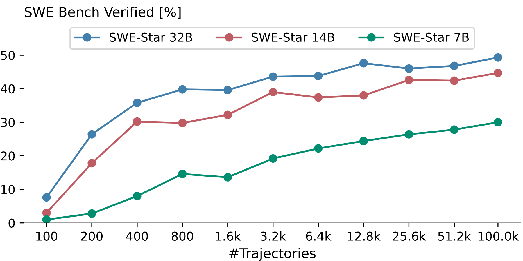 Interestingly, we observed much more efficient initial scaling compared to SWE-Smith, despite similar teacher performance. However, this quickly saturated, reaching about 40% SWE-Bench Verified resolution rate with only 800 trajectories for the 32B model. From there on, scaling continues after a short plateau at a significantly slower rate.