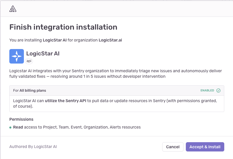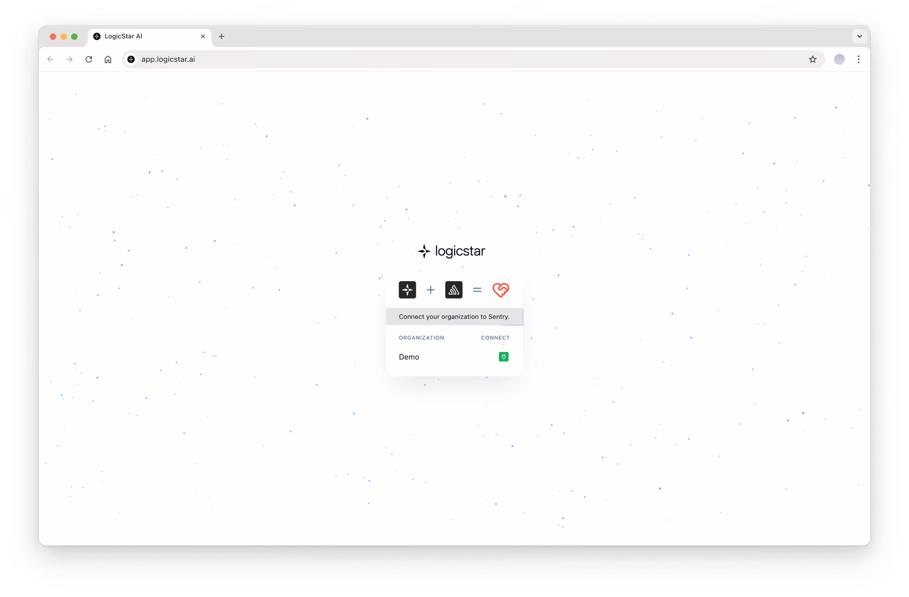 Go to the Logicstar Sentry App: https://sentry.io/sentry-apps/logicstar/external-install/